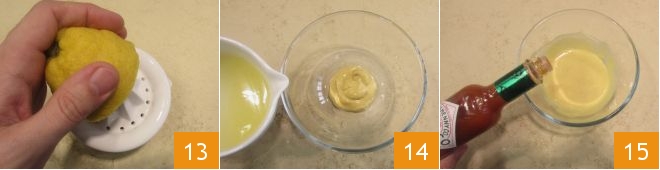 Now, prepare the accompanying sauce: squeeze the lemon juice 13. In a small bowl, pour the mustard, add the lemon juice 14, and season with a few drops of Tabasco 15.