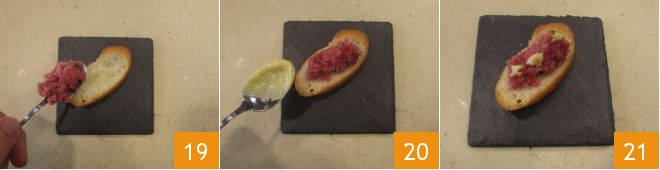 place a bit of tartare 19, season with a few drops of mustard sauce 20, and continue with the others; enjoy your beef tartare on bruschetta immediately 21!