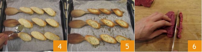 and oregano 4. Place in a preheated convection oven at 375°F for 10 minutes, or until the bread is golden brown, then remove them from the oven and let cool slightly 5. Now take care of the meat: take the beef fillet (very fresh), place it on a cutting board, and trim off any excess fat if present. Then cut the meat into strips 6