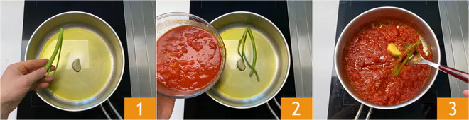 To prepare braised squid, start with the sauce. In a large pot, pour the oil, garlic, and parsley stems 1, let the oil infuse for about two minutes over low heat. Pour in the peeled tomatoes already reduced to pulp when the oil is hot 2. Let it cook slowly for at least 30 minutes, stirring occasionally and keeping the lid partially closed. If it dries out too much during cooking, you can add a little water. When the cooking is finished, the sauce will have thickened, remove the garlic and parsley with kitchen tongs 3.