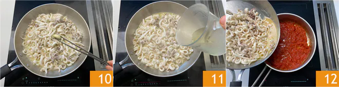 Remove the garlic 10 and deglaze with white wine, allowing it to evaporate over high heat 11. Pour the squid with all the seasoning into the tomato sauce 12.