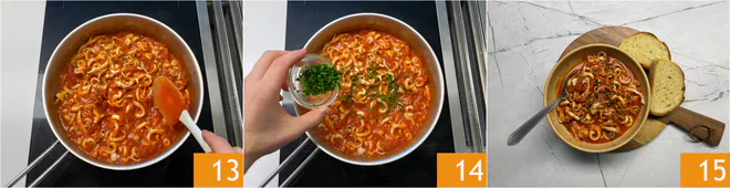 Salt, if necessary, pepper and let it flavor for another 1-2 minutes over high heat 13. With the heat off, add the finely chopped parsley 14 and a drizzle of raw oil. Your braised squid is ready to be served hot 15.