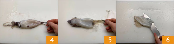 Then take care of cleaning the squid: rinse them under running water, then with your hands remove the skin 4 and detach the head from the mantle along with the cartilage pen 5. Wash the squid again thoroughly to extract the innards. Now open the mantle like a book with a knife and cut it in half 6.