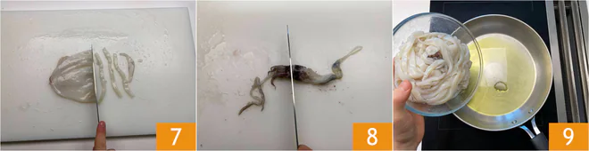 Cut into strips about 0.2 inches wide 7 and, when you're done, move on to the head: separate it from the tentacles by cutting just below the eyes 8 so you can keep the tuft. Heat the olive oil in a pan with the whole peeled garlic clove. Pour in the cleaned squid and tentacles and sauté over high heat for 2-3 minutes: they will curl up 9.