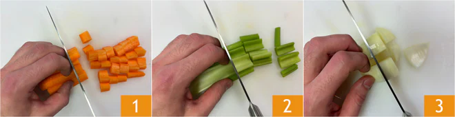 To prepare braised beef with Barolo, first peel and chop the carrot 1, celery 2, and onion 3.