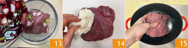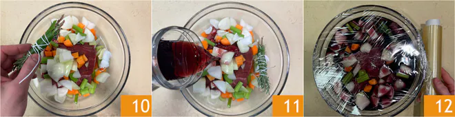 Add the cheesecloth with spices and the bouquet garni 11. Cover with red wine 12, seal with plastic wrap, and let marinate in the refrigerator for 8-12 hours 13.