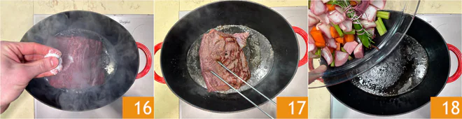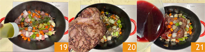 Salt 16 and sear the meat on all sides, for a total of 4-5 minutes 17. Remove the meat from the pot and add the vegetables 18.