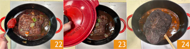 Add tomato paste 22, stir, and cover with a lid 23. Bring to a boil and let simmer for 2 hours and 20 minutes, turning the meat halfway through. Once cooked, remove the meat from the pot 34, then discard the spices and herbs.