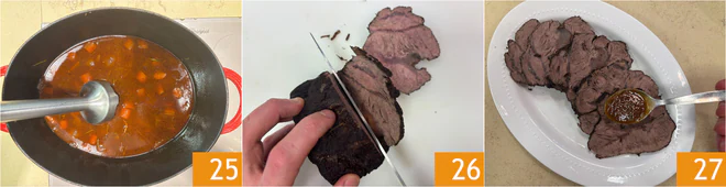With the heat off, blend the cooking juices with an immersion blender 25, then raise the heat and reduce by half, uncovered. Ready to plate: slice the braised beef into pieces about 0.4 inches thick 26, place on a serving dish, and drizzle with the sauce from the cooking juices 27.