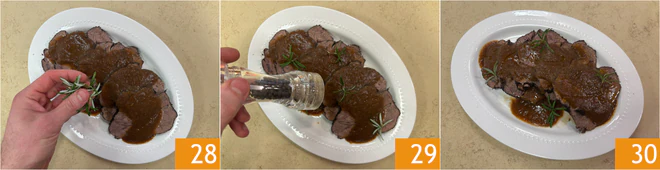 Garnish with rosemary 28 and a grind of pepper 29. Your braised beef with Barolo is ready to be served 30!