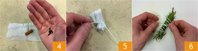 Wrap the cinnamon stick and cloves 4 in a cheesecloth 5. Prepare a bouquet garni by tying together rosemary and sage 6.