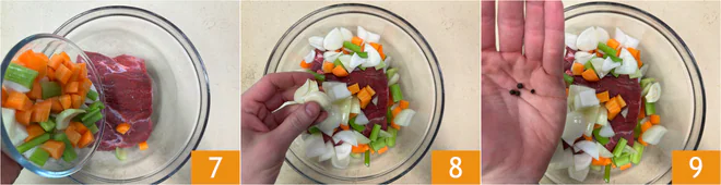 After cleaning the beef shoulder, place it in a large bowl with the vegetables 7, garlic 8, and whole peppercorns 9.