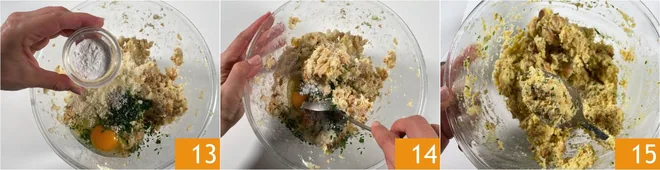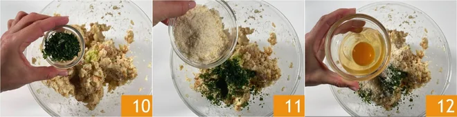 Now add the parsley 10, the grated Parmigiano cheese 11, and the egg 12.