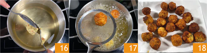 Shape the mixture into a ball with your hands, or immerse the mixture in the oil using another spoon 16. Fry a few balls at a time until golden, ensuring the oil temperature doesn’t go down too much 17. Drain the bread fritters on paper towel and enjoy while still hot 18!
