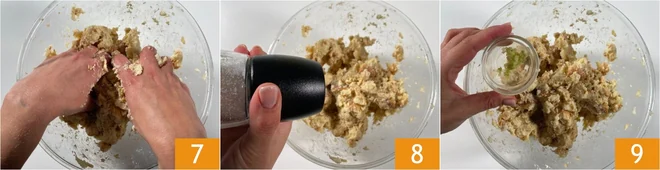 Break up the milk-soaked bread using your hands 7, then add salt, pepper 8, and the chopped garlic 9.