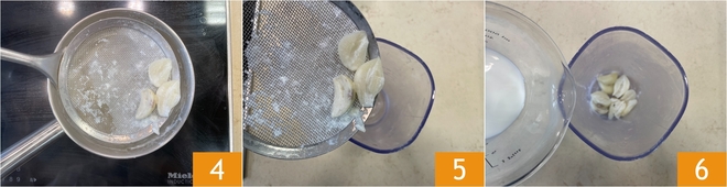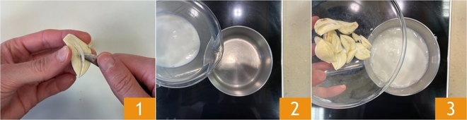 Bring to a boil, then drain them 4. Repeat this procedure 2 more times, replacing the milk each time. Finally, transfer the cloves to a jug 5, add the remaining 100 ml of milk 6, and salt.