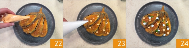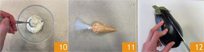 Mix 10, transfer to another piping bag 11, and store in the fridge. Now move on to the eggplants: remove the side ends, then cut them into 4 slices, keeping them attached to the stem 12.