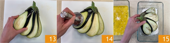 Open the slices like a fan 13 and gently flatten them with a meat pounder 14. First, coat them in flour 15.