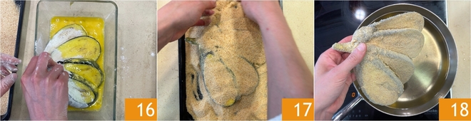 Then dip them in the beaten egg 16 and finally cover them with breadcrumbs 17. Now heat the vegetable oil in a saucepan for frying, and once it reaches 356°F, immerse the breaded eggplant 18.