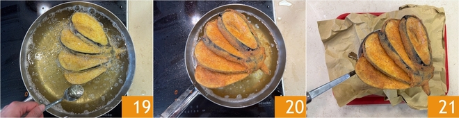 Fry for about 7 minutes per side 19, until golden. Drain 20 on absorbent paper to remove the excess oil 21.