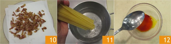 Place the guanciale on absorbent paper 10 and cook the bucatini in the boiling salted water for 2-3 minutes, just enough for them to soften 11. In the meantime, dilute the saffron in a little cooking water 12.