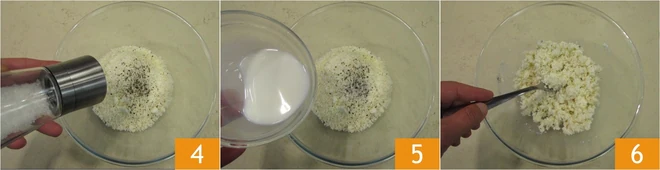 Add a little pepper and salt 4, then the milk 5, and stir with the fork 6. Heat some water in a saucepan for cooking the pasta.