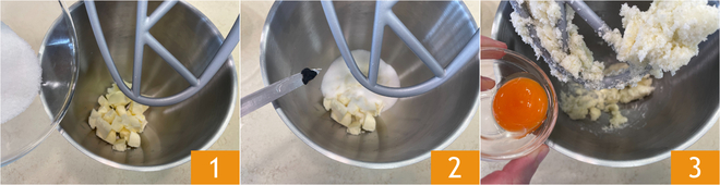 To prepare butter cookies, first place the cold butter in the bowl of the stand mixer equipped with a paddle attachment. Add the sugar 1, a pinch of salt, the seeds of the vanilla bean 2, and run the machine for a few seconds. When the butter has softened, add the egg yolk 3 and mix for about a minute.