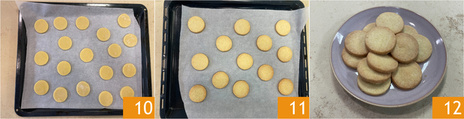 After forming the cookies, place them on a baking tray lined with parchment paper, spacing them slightly apart 10. Bake in a static oven at 340°F for about 15 minutes 11, then remove from the oven and let cool. Your butter cookies are ready to be enjoyed 12!