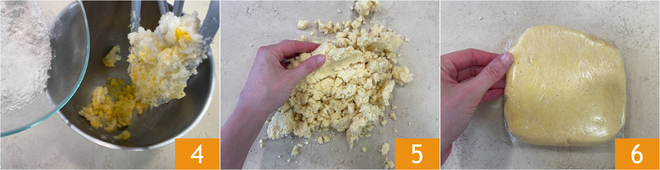 Now add the flour 4 and run the stand mixer again. Once the flour has been absorbed into the mixture, transfer it to the work surface and compact it to form a dough, being careful not to overwork it to avoid gluten formation 5. Wrap the dough in plastic wrap 6 and let it rest in the refrigerator for 30 minutes.