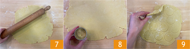 After the resting time, take the dough and, using a little flour, roll it out to a thickness of about 5/16 inch 7. If it seems too hard, you can soften it by gently hitting it with the rolling pin. Use a cookie cutter with a 1 1/2-inch diameter to cut out the cookies 8; you will get about 40 of this size. You can reuse the scraps 9 by kneading them again and letting the dough rest in the fridge for another 30 minutes.