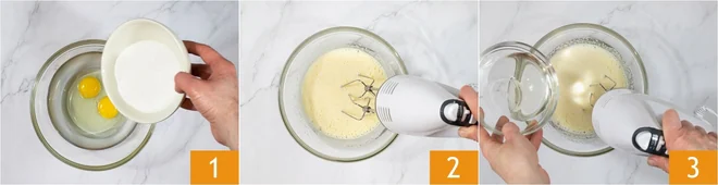 To prepare butter-free waffles, start by breaking the eggs open and placing them in a bowl. Add the sugar 1 and start beating with an electric whisk until light colored and frothy 2. Gradually add the oil 3 while beating with the whisk all the while.