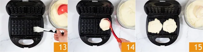 Grease the waffle maker 13 and heat it up. Place a ladle of batter in the right side 14 and another in the left side 15. Close the waffle maker and cook for 5 minutes.