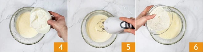 Now add the yogurt 4 and beat some more with the whisk to stir it in 5. Add some of the flour 6.