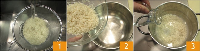 To prepare Cantonese rice, first rinse the rice under running water several times 1, until the water becomes transparent. It's a fundamental step. Then pour the washed rice into a pot 2 and cover it with water 3. Resting the palm of your hand in the pot, the water should reach the level of your knuckles. The recipe does not require it, but if you wish, you can flavor the rice with a pinch of salt and a drizzle of oil at this stage.