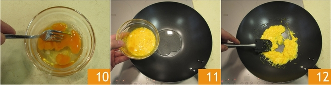 Beat the eggs in a small bowl 10. Put the wok on the fire: when it is hot pour the vegetable oil and let it heat up for a moment, then add the eggs 11. Cook over medium heat for about one minute, stirring to achieve the scrambled effect 12.
