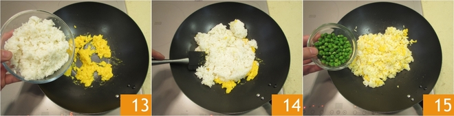 At this point, add the rice 13 and toss it together with the eggs for another minute 14, then add the peas 15.