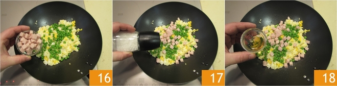 Also add the cooked ham 16, then season with a pinch of salt 17 and with rice wine 18.