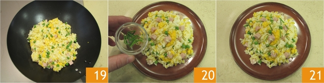 Sauté over medium heat for 2-3 minutes to blend all the ingredients 19. Those who wish can also add some soy sauce. Transfer the rice to the plate and garnish with chives 20. Your Cantonese rice is ready to be served 21!