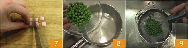 In the meantime, prepare the rest of the ingredients: dice the cooked ham into cubes 7, then blanch the peas for about 3 minutes 8, drain them and rinse under cold water to preserve their color and texture 9.