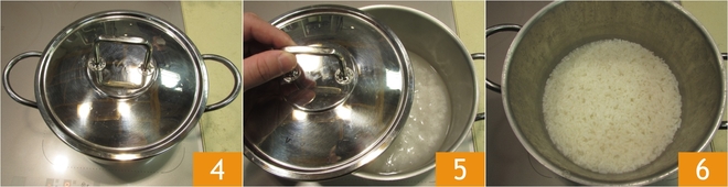 Cover with a lid 4 and bring to a high heat, waiting for it to boil. After boiling, cook for another 2-3 minutes, lowering the temperature slightly if necessary during these minutes. You should not open the lid during these phases, otherwise, you will let the steam escape. Now, lower the flame to the minimum and cook for about 10 more minutes. After these 10 minutes, you can check by slightly lifting the lid if the water has been absorbed 5. If so, proceed on high heat for another 2-3 minutes until the water is completely absorbed. After this time, turn off the heat and make sure the water has been absorbed by quickly opening the lid, then cover again. Turn off and let the rice rest in the pot for 10 minutes, still covered 6.