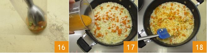 Blend the cooked vegetables you left to one side with an immersion mixer 16. When the rice is nearly done, add the cream 17, add salt to taste and stir 18.
