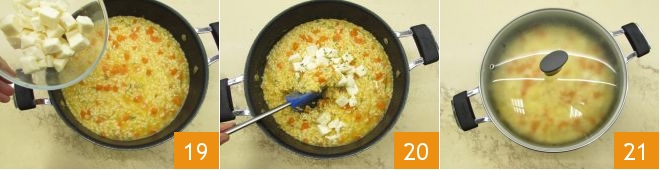 Once cooked, remove the saucepan from the stove, add the diced cheese 19 and stir 20. Put the lid on and wait 1-2 minutes 21,