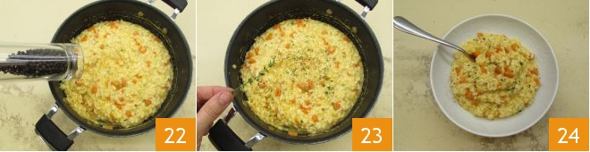 then add the black pepper 22 and thyme leaves 23. Stir one last time and serve your carrot risotto nice and hot 34.