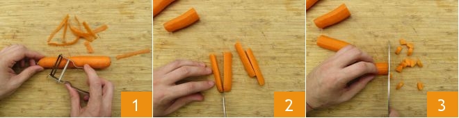 To prepare carrot risotto, start by making the vegetable broth. When ready, keep it hot and peel the carrots 1. Cut them into sticks 2 and then into pieces, each around 0.4 inches (1 cm) in size 3.