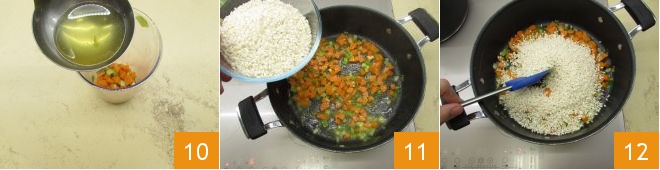 and place in the mixer glass, along with a ladle of vegetable broth 10 and leave to one side. Place the rice in the saucepan with the cooked vegetables 11 and stir to toast it 12.