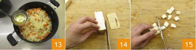 Continue adding broth when necessary, until the rice is fully cooked 13. In the meantime, remove the crust from the taleggio cheese 14 and dice it 15;