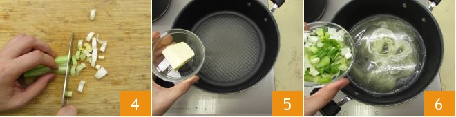 Peel and finely slice the spring onion 4. Melt the butter in a saucepan 5, add the spring onion 6