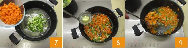 and the carrots 7. Add a ladle of vegetable broth 8 and leave to sweat for around ten minutes; add more squash if necessary. One the time is up, remove a spoon of the cooked vegetables 9
