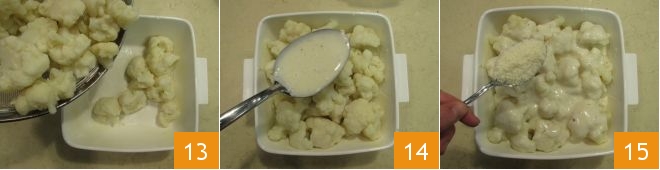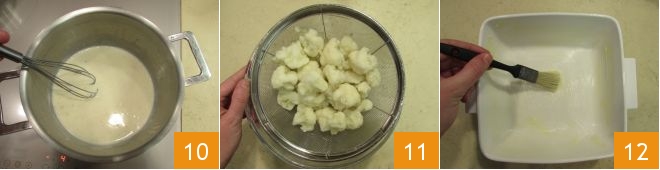 The béchamel should remain quite liquid 10. In the meantime, the cauliflower florets will be cooked, drain them thoroughly 11 and set them aside for a moment. Butter an 8x8 inch baking dish 12