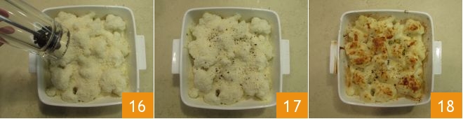 Season with pepper to taste (16-17) and then bake in a preheated oven at 356°F in static mode for 10 minutes. After this time, set the grill mode at 430°F and bake for another 10 minutes, to obtain a golden crust. Your cauliflower au gratin is ready to be served 18.